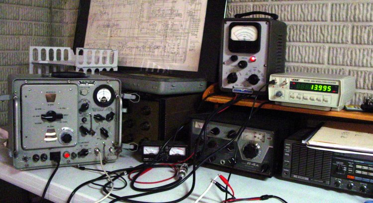 A recent look at the lab From left to right: URM 25C RF signal generator, Galaxy 300, Drake R-4A, HP 410B VTVM, Victor frequency counter, Kenwood R-2000 | |
