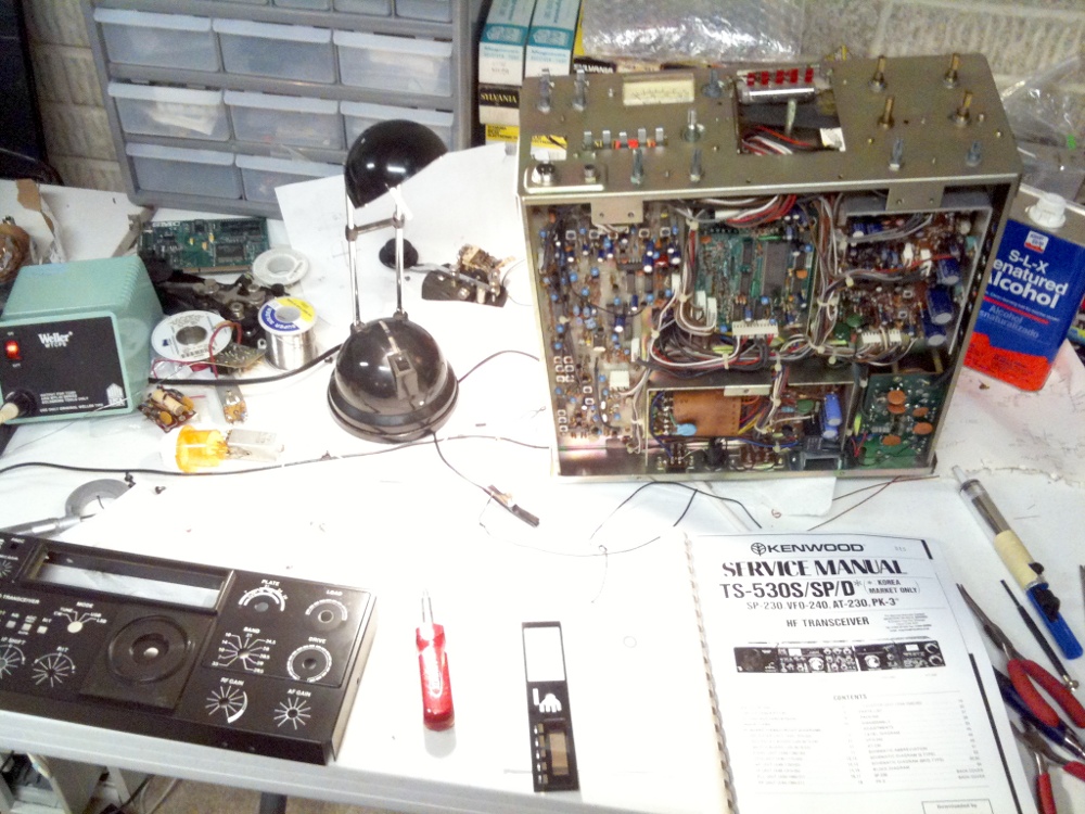 그 다음 대부분의 조정은 TS-530의 서비스 메뉴얼을 따라 하였습니다. 크게 틀어진 것은 없었고, 다만 7MHz와 3.5MHz의 밴드 중심 주파수를 약간 옮기기 위해서 RF부의 세가지 동조 회로, 즉, 수신 동조, 드라이버 출력, PLL에서 나온 프리믹스 (캐리어를 포함한 밴드 LO + VFO) 인젝션을 조정한 것이 가장 크게 바꾼 것입니다. 그리고 노이즈 블랭커를 조정했더니 효과가 괜찮습니다. 노이즈 브릿지를 물려서 실험/조정해봤는데, 임펄스 노이즈는 확실히 줄여주고, 랜덤 노이즈도 효과가 좋습니다.