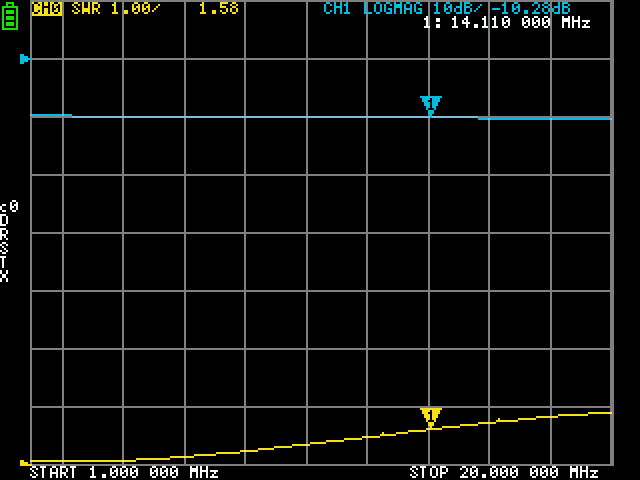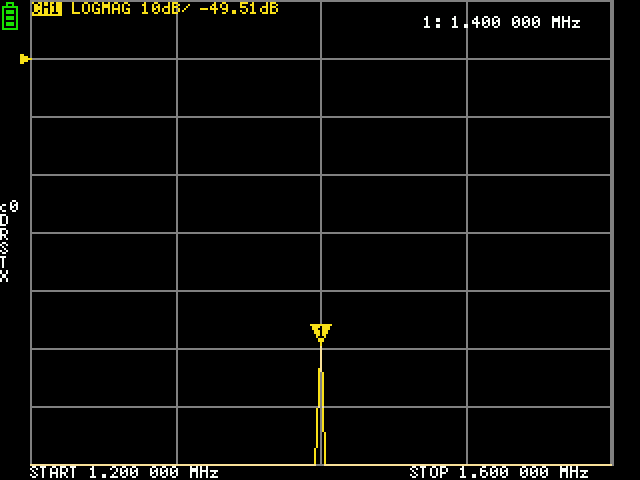 There is a strong AM station on 1400 kHz in my QTH. It even registers on NanoVNA CH1 with a resonant HF dipole, which attenuates non-resonant signals. The CH1 is calibrated against the output level of CH0 at each frequency. On 1400kHz, CH0 output is measured to be +4.5dBm, so the picture below is showing a -45dBm signal. With a long wire antenna, it is over -10dBm. In my case, just several dB of attenuation was enough to prevent the overload.