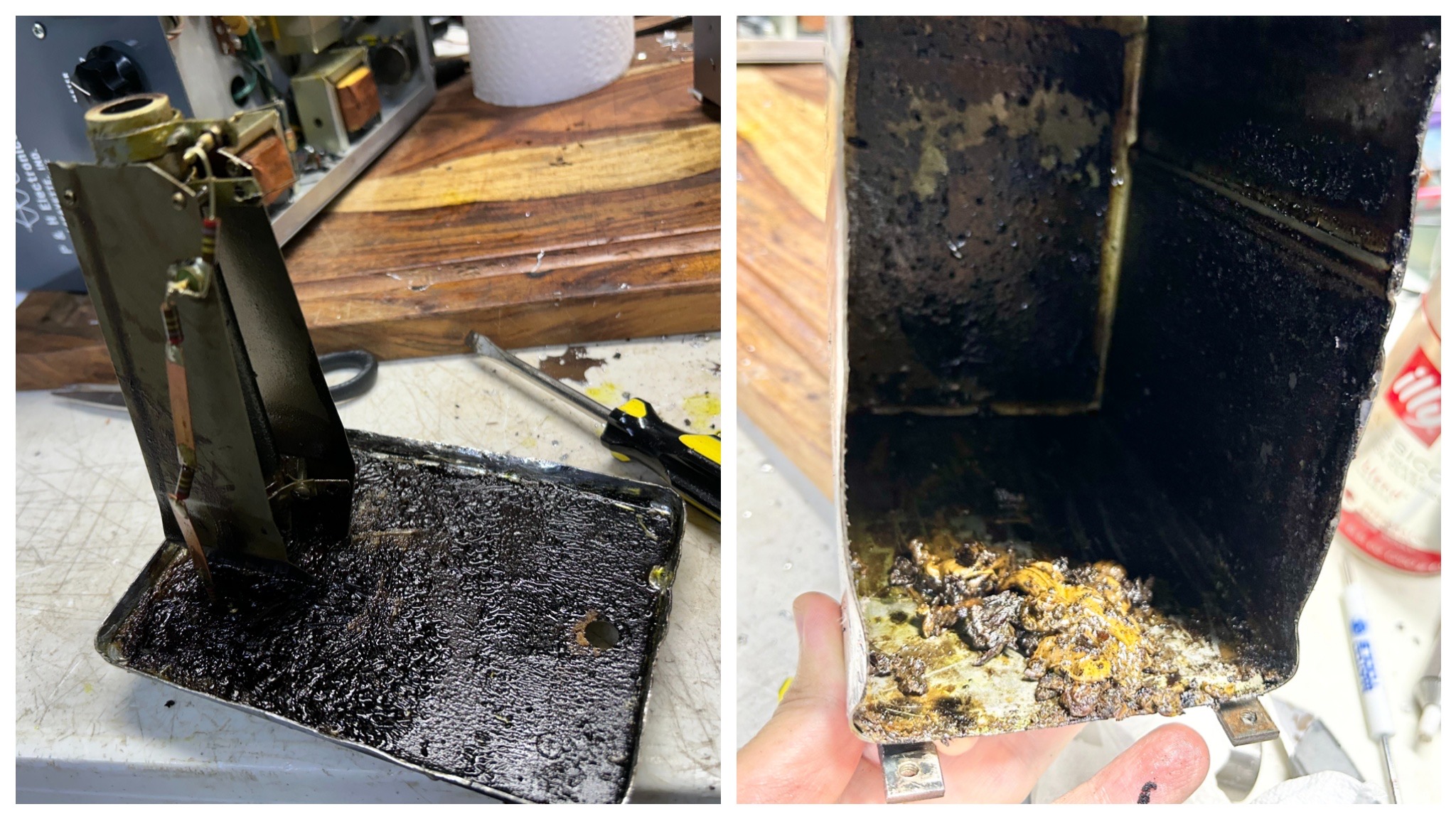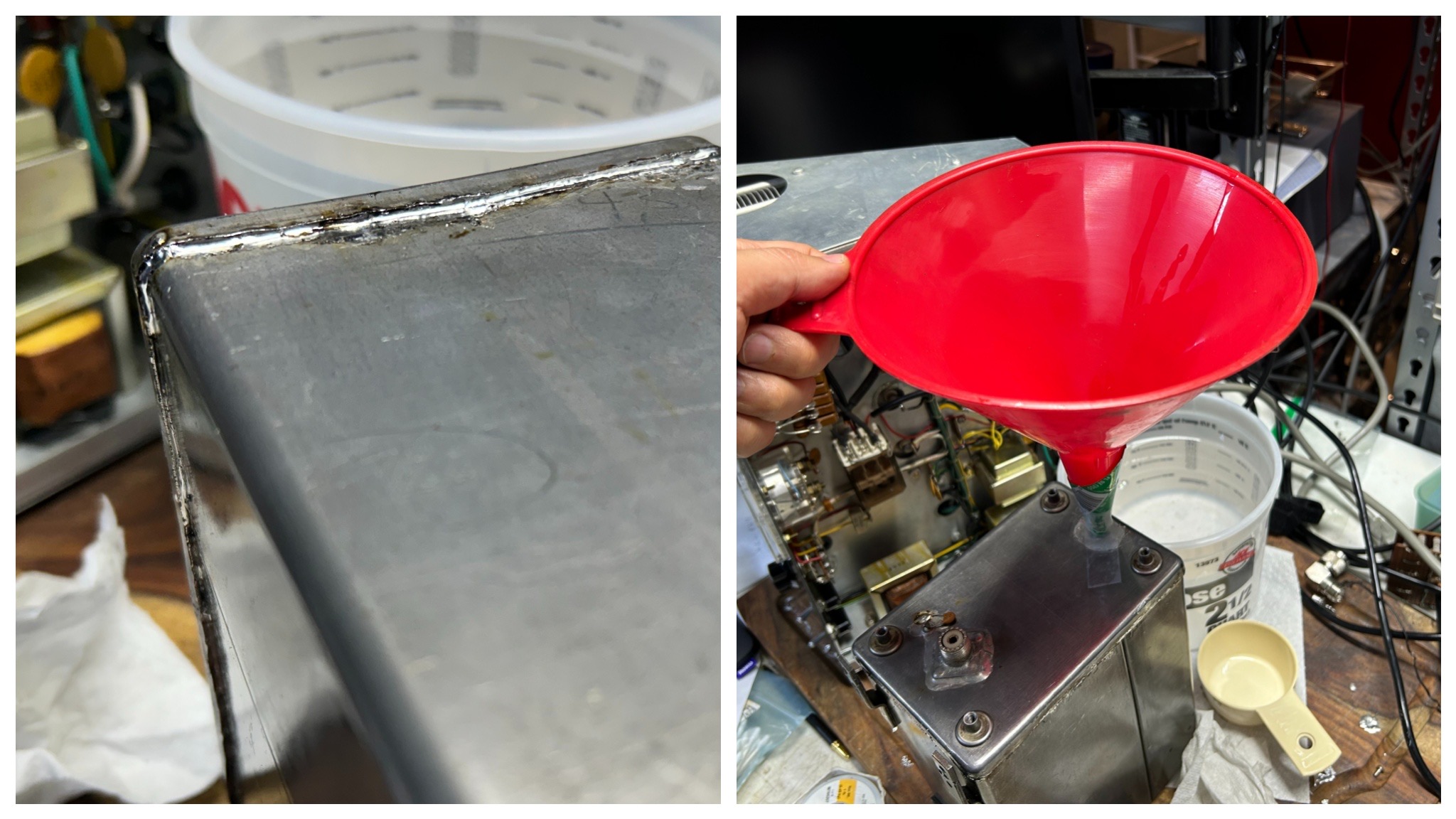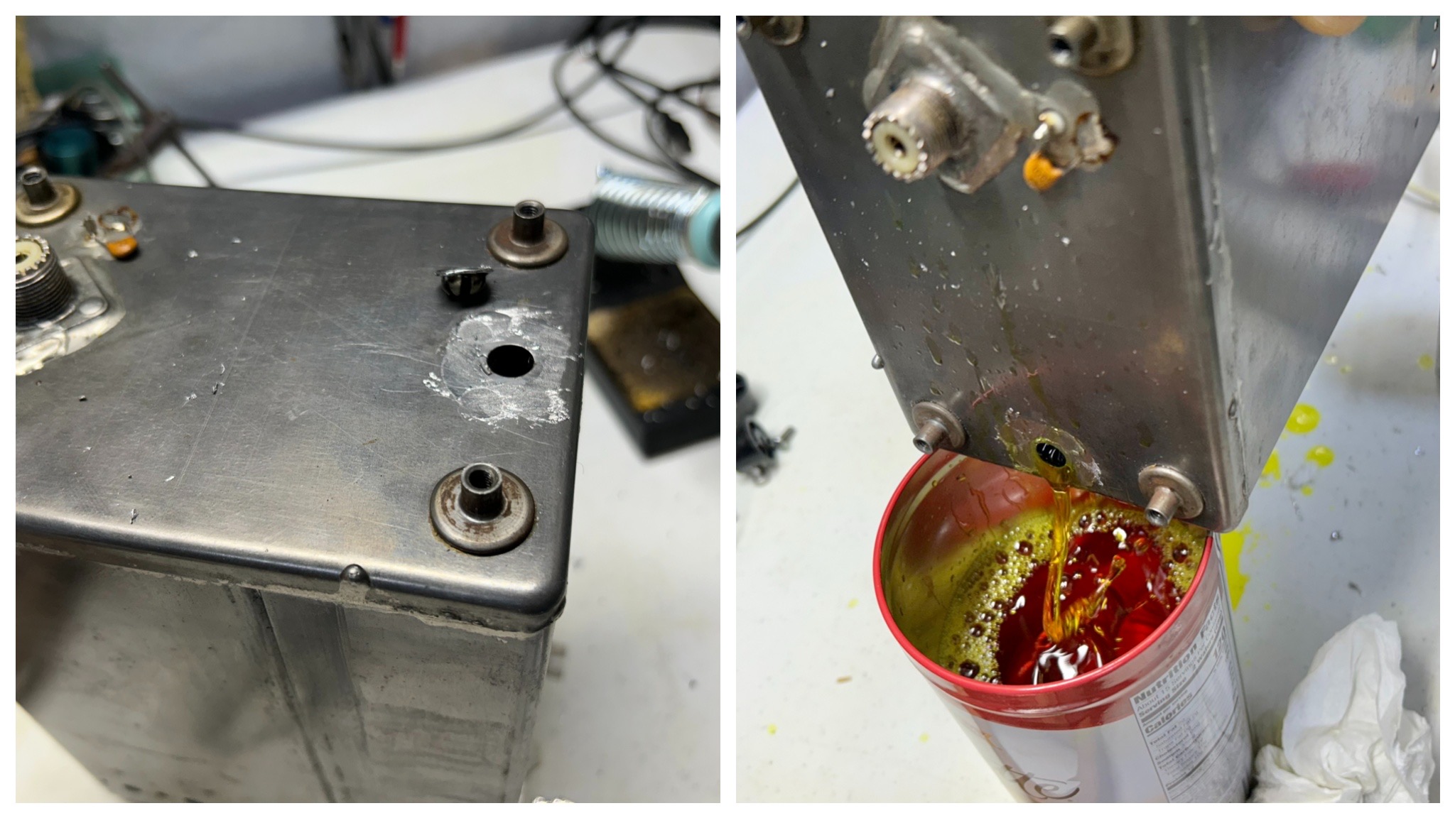 Waters 384 Dummy Load Restoration![]() 2011년 여름에 가까운 동네의 작은 햄페스트에서 입수한 Waters사의 Model 384 Dummy Load. 1.5kW로 송출시 4분, 50W 연속은 시간 제한 없다고 합니다. 사각 깡통 내부에 채워진 오일이 달아올라 섭씨 105도 정도가 되면 전면의 경고등이 켜집니다. 처음 입수했을 때도 오일이 조금씩 새고 있었는데, 이전 주인이 정해진 온도를 넘어 혹사를 시켰을 가능성이 큽니다. 약간씩 샜지만 그래도 쓸만했는데, 얼마전 약 200W의 종단 출력 실험에 사용했더니 다음 날 책상에 30cm 지름으로 새어나와 퍼져나와 있더군요. 그래서 이번에 힘을 써서 고쳐보자 마음을 먹게 되었습니다. ![]() 일단 캐비넷에서 꺼낸 후 앞판과 뒷판을 떼어내어 직육면체 깡통이 나오면, 플러그와 납땜으로 막아논 오일 주입구를 다시 엽니다. 100와트 인두를 동원하여 간단하게 열었습니다. 그 다음 내부의 트랜스포머 오일을 비워냅니다. 그 동안 얼마나 새어 나왔을까 알 수 없지만, 용적을 보면 2 리터를 약간 넘는 양이 적정량입니다. ![]() 그 다음은 SO-239 코넥터가 붙어 있는 뒷면 뚜껑을 떼어냅니다. 모서리가 삥 둘러 납땜이 되어 있는데, 이건 떼어내는데 좀 고생을 했습니다. 성공적으로 열어보니, 역시 과거에 혹사당하여 오일이 타고 슬러지가 두껍게 껴 있었습니다. 금속판에 이런게 두껍게 붙어 있다면 열전달이 안되어 냉각 시간도 길어지겠죠. 내부에는 입력 신호에 대하여 저항 분압 회로가 로드 저항 자체에 있고 (53옴 - 5.5옴), 거기에 크리스탈 다이오드가 포함된 측정용 회로가 있습니다. 약 1/10의 전압을 검출하는 것입니다. 이 깡통 더미로드는 원래 334라는 모델을 위해 만들어졌는데, 거기에는 파워 미터가 달려있으며 1kW까지 측정이 가능합니다. 회로를 비교하니 그것과 동일합니다. 다만, 그 설명서에는 1kW를 넘으면 다이오드가 망가지므로 넘지 말라고 되어 있습니다. 미터가 없는 이 384 더미로드는 내부 검출 회로는 사용되지 않고 1.5kW 까지 사용하도록 되어 있는데, 그래서인지 다이오드는 망가져 있었습니다 (쇼트). 다른 직렬 저항들은 변화없이 값이 정확했습니다. ![]() 최대한 긁어낸 후 남은 것은 휘발유를 부어 청소를 했습니다. 깨끗하게 청소한 모습입니다. ![]() 청소 후 재조립하면서 다이오드를 BAT46로 교체했습니다. 교체 전과 비교해 보았습니다. ![]() 며칠 후 주문한 미네랄 오일 1갤런과 고온용 실리콘이 도착했습니다. 고온 실리콘은 섭씨 250도 까지 버틴다고 하고 오일에 내성이 강하다고 하여 선택했습니다. 코넥터의 씰이 망가져서 새고 있었으므로, 주변을 깨끗하게 닦아 내고서 납땜으로 접합할 수 있는 부분은 최대한 납땜으로 새지 않게 처리했습니다. 그리고서 코넥터 주변에 실리콘을 넉넉하게 도포하였습니다. ![]() 24시간 경과 후 드디어 뚜껑을 덮고 납땜으로 다시 봉합니다. 가장 재미있는 작업입니다. 몇 번이나 확인과 보완을 한 후 오일을 주입합니다. 구멍이 작아서 음료수 캔을 잘라 구멍에 맞는 미니 깔때기를 만들었습니다. 거기에 큰 깔때기를 대고 오일을 천천히 살살 넘치지 않게 부어 넣습니다. 물론 미리 적정량을 측정하여 덜어 놓았습니다. ![]() 이날 저녁 리니어 앰프를 통해 500W를 더미로드에 송출하며 실험을 했습니다. 중간에 잠깐씩 쉬어가며 약 20분을 송신하니 램프가 켜집니다. 연속 송신이라면 약 8-9분 만에 켜지지 않았을까 합니다. 메뉴얼의 그래프와 얼추 맞습니다. 30분 정도가 지나자 냉각이 되어 불이 꺼졌습니다. 원래는 110V짜리 전구가 들어 있는데, 이참에 LED로 교체하고 110V 대신 AA 배터리 네개로 6V DC를 넣도록 개조했습니다. 아직 까지는 전혀 오일이 새는 기미가 안보입니다. 부디 이 상태로 오래 오래 가길 바랍니다. (C) 2025 K9SUL |